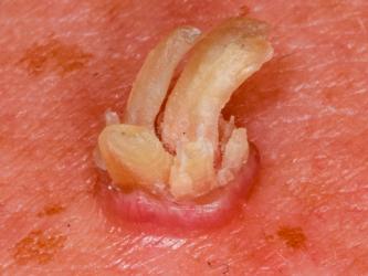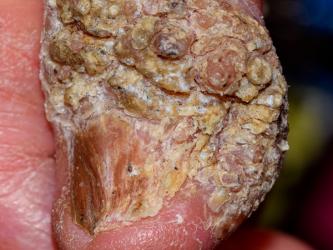 Fotografía con muy buen detalle de las características clínicas de esta lesión en piel.